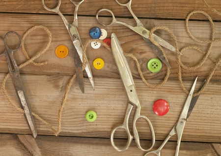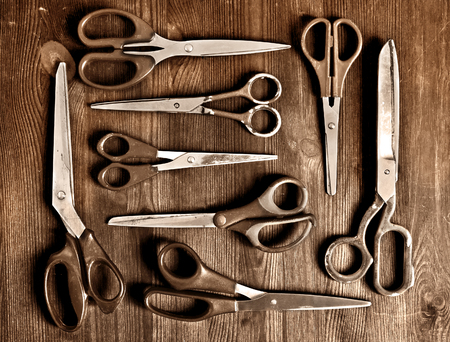 set of old scissors on a wooden background