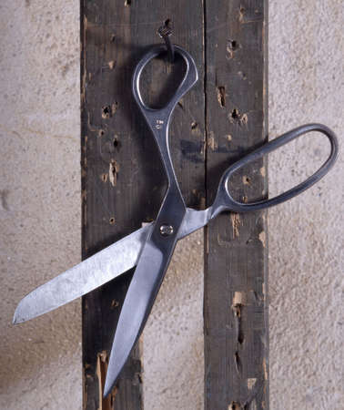 Scissors for cutting leather on wood wall