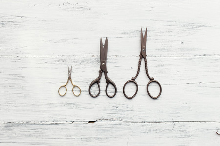 Three scissors on white wooden table