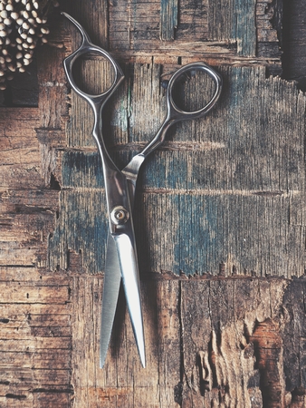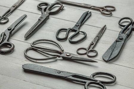 Vintage steel scissors on wooden table background. Old-fashioned instruments for florist, barber, seamstress. History, professional collection of equipment, beauty of workplace. Vintage, retro style.