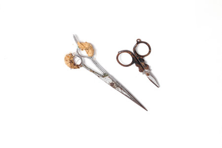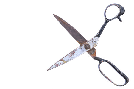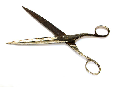 Rusty and old scissors on white background