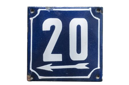 Weathered grunge square metal enameled plate of number of street address with number 20 closeup isolated on white background