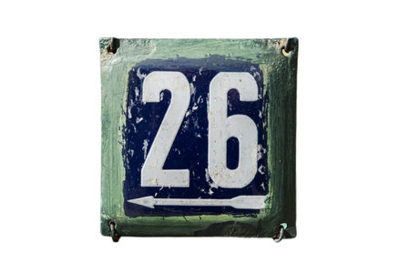 Weathered grunge square metal enameled plate of number of street address with number 26 isolated on white background