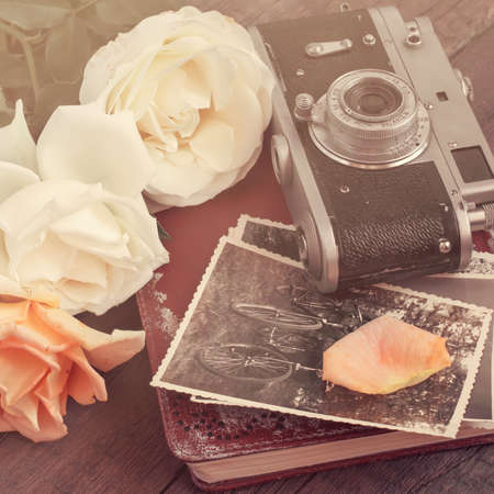 Bouquet of roses and old photo, retro camera and album.
