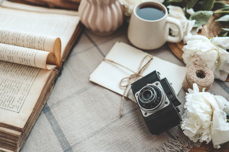 retro photo camera with book and fresh pink peony flowers.