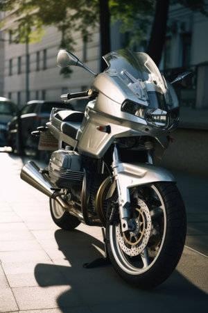 Silver motorbike in city street, created using generative ai technology. Motorbike, travel and transport concept digitally generated image.