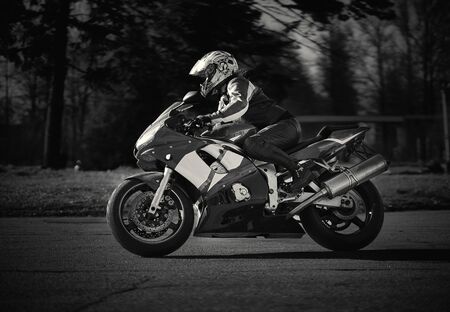 man riding motorcycle in asphalt road. Motorcyclist at black and white sport motorcycle.