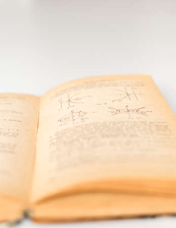 Close up shot of an open old science book containing equations and graphs from different fields: math, physics, chemistry. The pages have the marks of the past as they got orange.