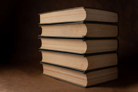 Side view of 10 old textbooks on a library desk. Shabby pages. Close-up. Selective focus. Landscape photo arrangement.