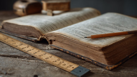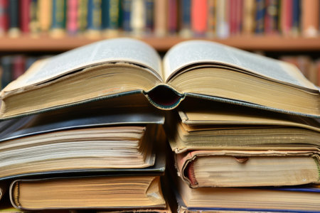 A close-up of an antique book stack, showcasing worn pages and intricate textures that reflect its rich history and timeless charm. Perfect for literary themes.