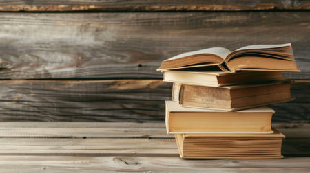Several books are neatly stacked on top of a wooden table, creating a simple yet organized arrangement. The books vary in size and color, adding visual interest to the scene.
