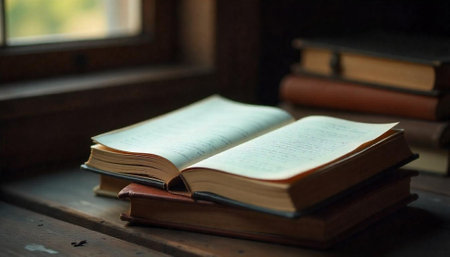 Open hardcover book with fanned pages resting on a stack of vintage books against a teal background in soft natural light.
