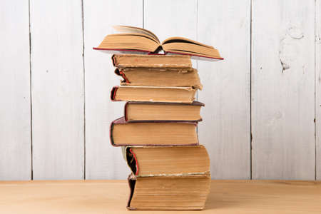 Open old hardback books stand on a wooden background. Science and education. World Book and Copyright Day.