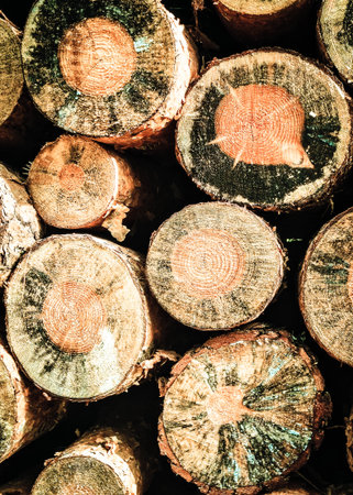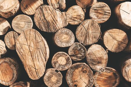 Background of wooden logs. Year rings. Pile wood. Deforestation theme. Wood industry. Chopped wood. Woodpile scene.