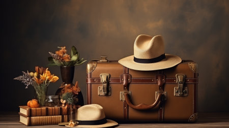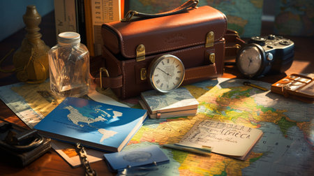A flat lay composition of vintage travel accessories like maps, leather bags, and antique cameras, creating a nostalgic scene of exploration and adventure.