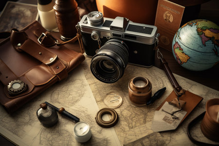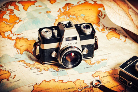 A vintage-inspired setup featuring a retro camera placed on a map, surrounded by travel-themed accessories for an adventurous vibe.