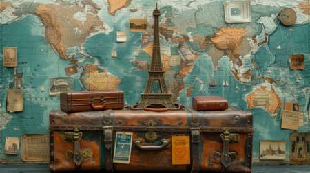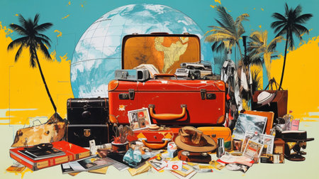Global Journey Collage: Vintage Suitcases, World Maps, and Iconic Landmarks with Passport Stamps