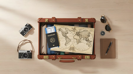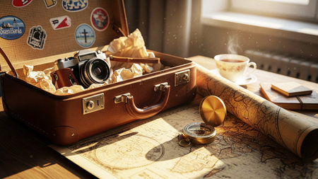 Open vintage suitcase reveals a world of adventure, featuring a detailed map, a camera ready for exploration, and stylish sunglasses for a perfect travel experience.