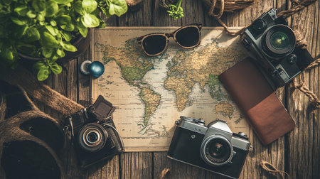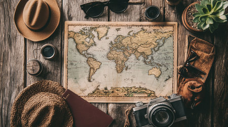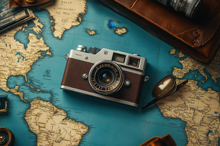A classic camera rests on a world map, surrounded by travel accessories like sunglasses and a leather bag, evoking a sense of wanderlust and exploration.