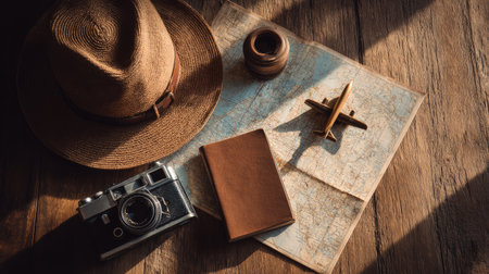 Traveler desk flat lay with hat, camera, notebook, map, and airplane model on textured wooden background, warm morning light