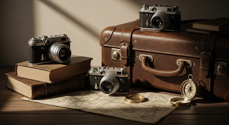 A still life composition featuring vintage cameras, antique books, a leather suitcase, a map, and a compass. The scene is set on a wooden surface with warm, directional lighting casting shadows, evoking a sense of nostalgia and adventure. The arrangement suggests a journey about to begin or a collection of cherished travel memories. The rich textures of the leather, paper, and metal are highlighted by the dramatic lighting.