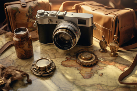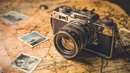 A vintage camera resting on an antique map, evoking a sense of adventure and nostalgia. Perfect for themes of travel, exploration, and photography.