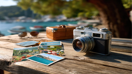 A vintage camera rests on a wooden table accompanied by vibrant photographs, capturing the essence of travel and outdoor leisure by the water.