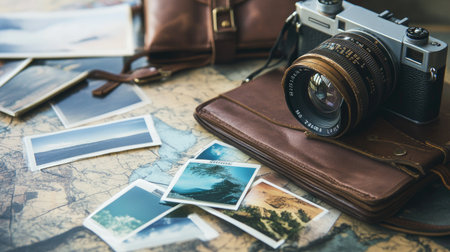A vintage camera rests on a textured leather bag beside a collection of travel photos scattered over an old world map, evoking a sense of adventure and nostalgia.