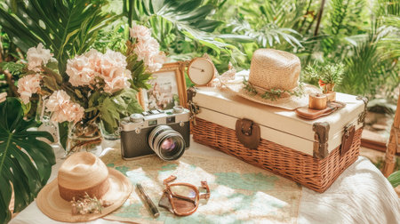 A beautifully arranged travel scene featuring a vintage camera, sun hats, and a map, set against a lush background of green plants, evoking a sense of adventure.