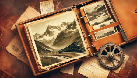 Worn leather postcard album open to reveal vintage Swiss Alps views, Ai generated image
