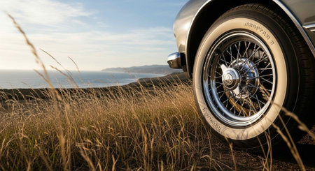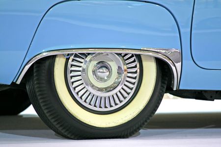 Whitewall tire of restored blue vintage car reflecting another vehicle
