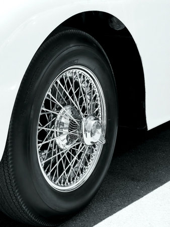 a shiny disc, black and white, a wheel of a car of old times. Close up of vehicle details. Concept of style and racing. Selective focus