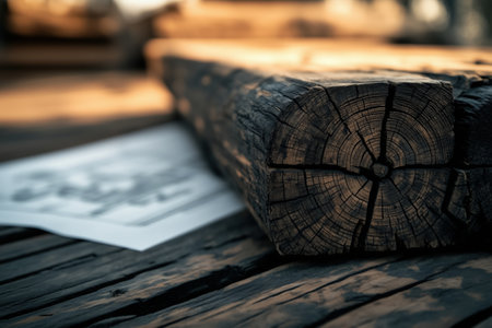 Rustic wooden beam and blueprint on weathered surface in warm light. construction and craftsmanship