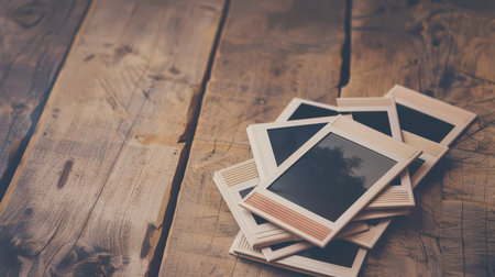 Wooden table featuring mockup frames for Polaroid photos
