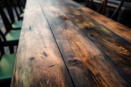 Empty outdoor old vintage wood table and chair in coffee shop restaurant