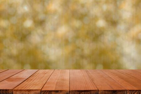 Empty wooden table and blur background of abstract in front of restaurant or coffee shop, cafe can be used Mock up for display of product or for montage.