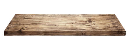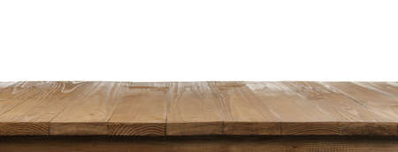 Wooden board empty table in front of a white background. Brown Wood Perspective - Can be used to showcase or assemble your products. Pick up to demonstrate the product. The texture of the old wooden floor from the boards.