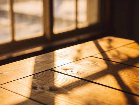 Wooden table and window with sunlight in a cafe. Selective focus.