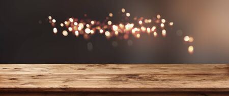 Perspective wood table with blur Christmas tree decorate string light in living room at home.Panoramic wooden countertop banner mockup for product display greeting card design online content