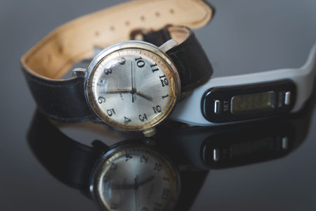 A classic wristwatch with a leather strap sits next to a contemporary fitness tracker, symbolizing the evolution of timekeeping technology