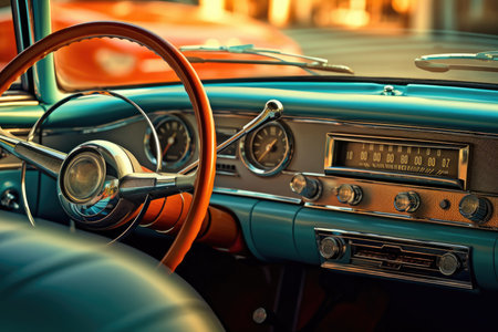 Closeup view of a classic vintage car, dashboard and interior details, selective focus