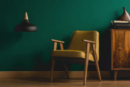 A modern, yellow armchair and a retro typewriter on an antique wooden dresser by a teal green wall in a dark, designer living room interior