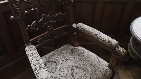Old furniture in country estate. Action. Beautiful old furniture in museum house. Old armchairs with table in aristocratic house