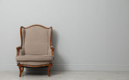Old-fashioned armchair near light grey wall, space for text. Used stuff