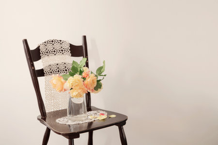 yellow roses in glass vase on vintage wooden chair