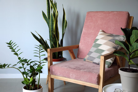Wooden soft armchair and houseplants near light wall