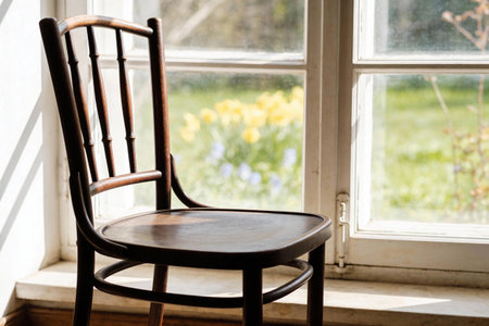 A vintage bentwood chair is positioned in front of a window, with a garden of yellow and blue flowers visible in the soft daylight