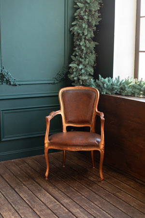 Stylish vintage brown armchair. Cozy retro living room decorated Christmas or new year. Mid Century design room. Decorated window with garland spruce branches. Holiday concept.