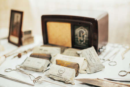 Different antique items on the table: old pocket watches, banknotes and coins of the Russian Empire, glasses in a case, silverware. Vintage background from a collection of antiques. Selected focus