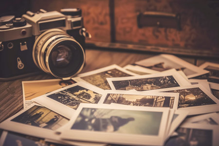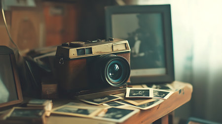 An oldfashioned camera rests on a wooden table, encircled by vintage photographs, creating a nostalgic ambiance filled with memories and emotions